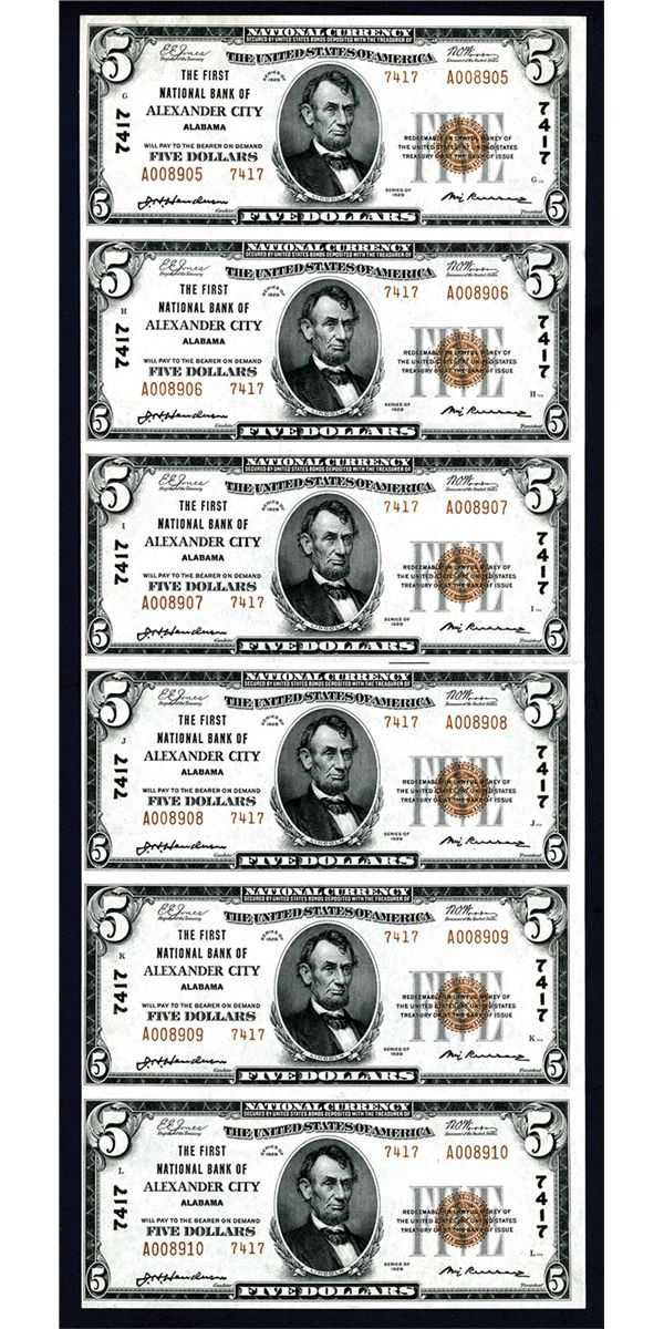 Uncut Sheet of Six Alexander City, Alabama Small Size Nationals. $5 1929 Type 2, First National Bank of Alexander City. Fr.#1800-2, Ch#7417. Issued banknote, S/N A008907, ppG-L. Almost Uncirculated, with a fold between the two center notes, and some other light teller handling. Lots of strong originally embossing is present. If cut, this sheet would probably yield mostly Choice to Gem examples. A similar sheet brought $5,462.50 in the Heritage FUN Show sale back in January of 2010.