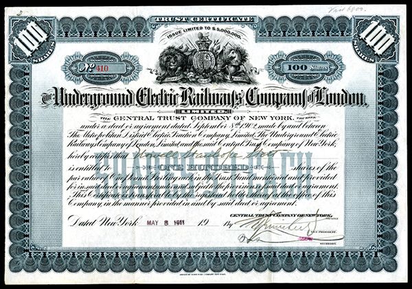 Underground Electric Railway Company of London, 1911 Stock certificate. London, England, 1911, 100 Shares of Stock, I/U, VF/XF , Arms in middle, Extremely attractive and rarely seen issued. ABNC.