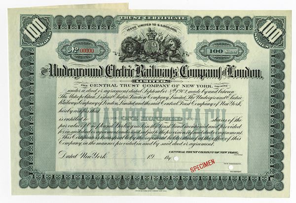 England. 100 Shares Stock, Specimen Certificate. Black print with blue/ grey border and underprint. Specimen overprints, POC's, XF condition. ABNC.