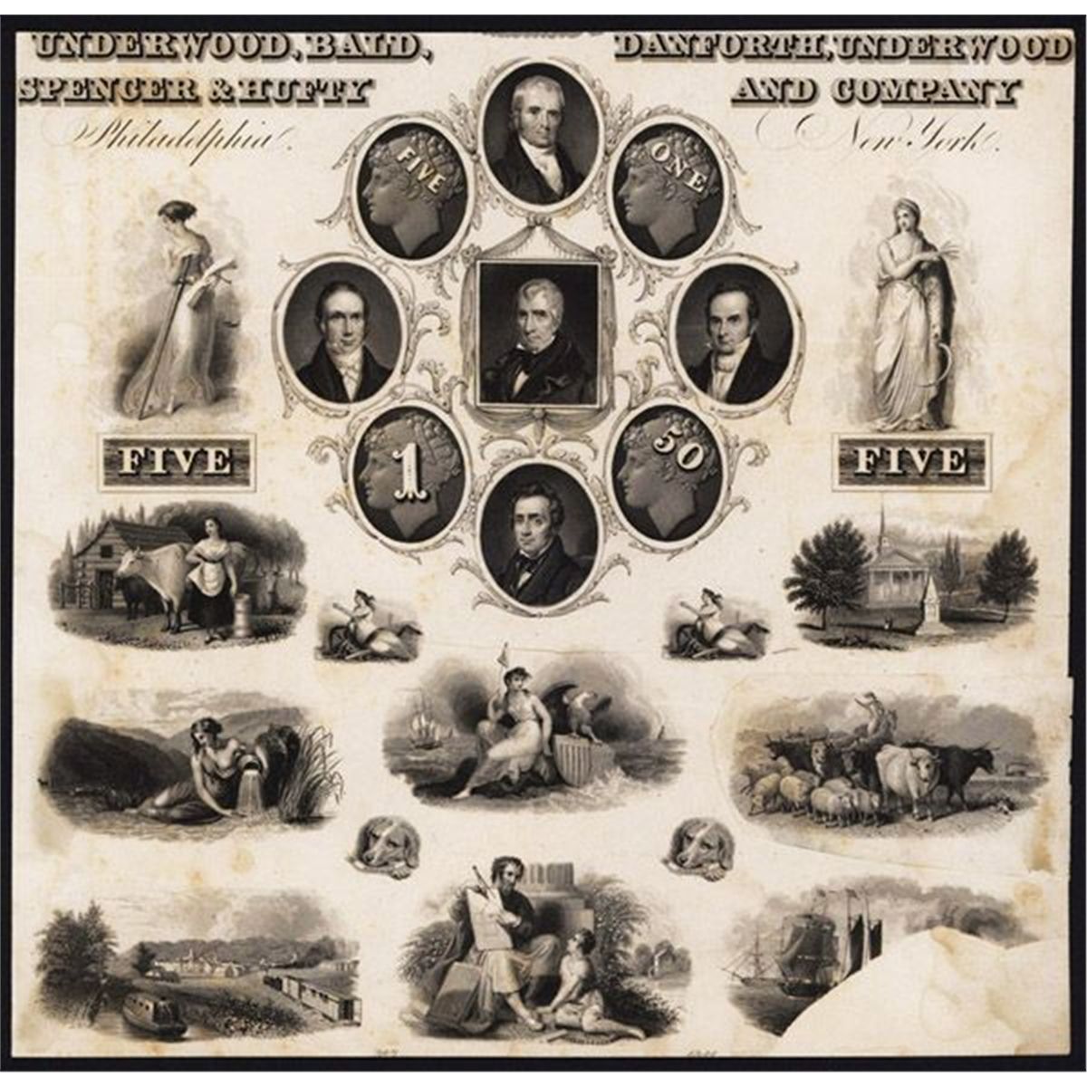 New York & Philadelphia, ND (ca. 1830-40's), Partial sheet that was cut down sometime in the past, 9.25 by 9 inches, black on india paper on soft card, Title of company on top with cirgular vignette of notables and cameos flanked by allegorical women with numerous vignettes below, appears Fine to VF with toning and piece missing from lower right corner. UBSH-DU, Rare sheet even if only a partial sheet.