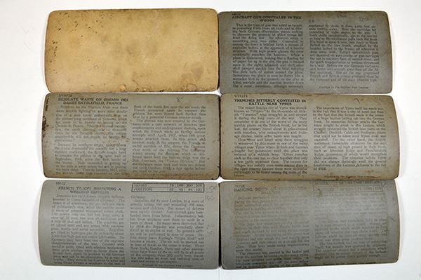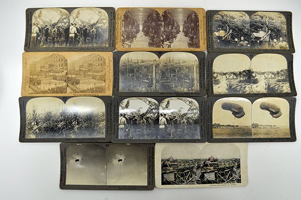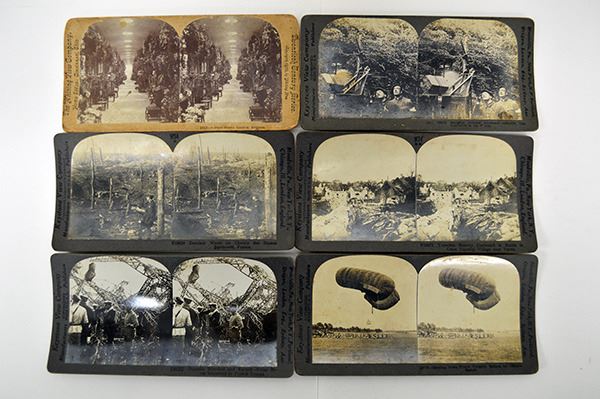 Stereo Views. Underwood is of West Point Cadets in the Centennial parade; Keystone cards are of WWI battlefields, blimps and zeppelin crash (duplicate); finally a Whiting View Co. card of Campo Santo, Laeken, Belgium. 11 pieces.