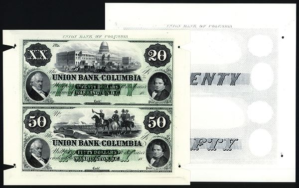 Washington, D.C. Lot of 2 notes (uncut sheet of 2) and 2 under tint proofs, 18xx (printed originally in the 1850-60's, this sheet is ca.1960-70's), $20-50, (DC-365-G6a; G8a), Modern "Proprietary Proofs". The $20 proof has portraits of distinguished men on lower left and right and capital building in middle. Notches on left and right margins for printing registration. Black printing with green underprint counterfeit protectors, printed on thin white card, Also included is the underprint that is green on the note, but this is black only, also printed on thin white card, Both sheets are choice to Gem Uncirculated condition. ABNC. Archival "Proprietary" proofs rarely seen in sheet form with under tint sheet proof. (ABN Commemoratives, AIA XI, May 15, 2012)