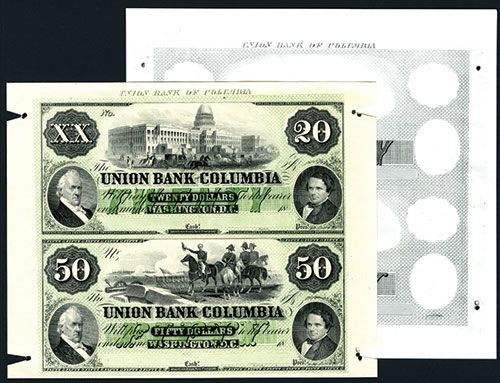 Washington, D.C. Lot of 4 notes (2 uncut sheet of 2notes), 18xx (printed originally in the 1850-60's, this sheet is ca.1970's), $20-50, (DC-365-G6a; G8a), Modern “Proprietary Proofs”. The $20 proof has portraits of distinguished men on lower left and right and capital building in middle. Notches on left and right margins for printing registration. Black printing with green underprint counterfeit protectors, printed on thin white card, Also included is the underprint proof in black instead of green. All are Choice to Gem Uncirculated condition. ABNC. Archival “Proprietary” proofs rarely seen in sheet form.