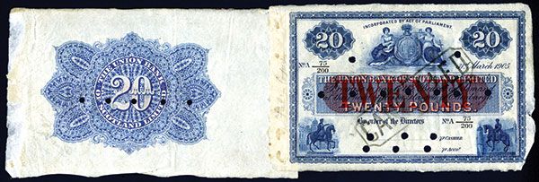 Lot of 2 pieces, Scotland, 31st March, 1905, 20 Pounds, P-S808 Unlisted Specimen, Face Blue with red underprint, allegorical women flanking arms on top, Equestrian Statues on LL and LR, back blue, face with archival notations including approval signatures and date, S/N A, POC's and hand stamp cancelled, Choice XF to AU condition. Also included is the progress proof of the face undertint with the normal back, Rare note in any condition and very attractive. Unpriced in SCWPM. W&S.