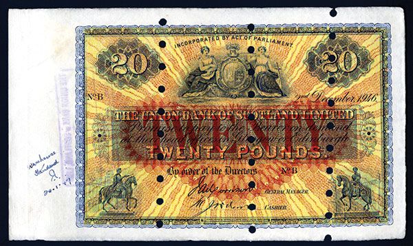 Scotland, 2nd December, 1946, 20 Pounds, P-S813c, Unlisted Specimen, Face Blue with orange and red sunburst underprint, allegorical women flanking arms on top, Equestrian Statues on LL and LR, back blue, back with archival notations including approval signatures and date, Back with handstamp “Exhibited...26 Mar 1947”, POC's, AU to Choice AU condition. Mounting remnants on back, Rare note in any condition and very attractive. W&S.