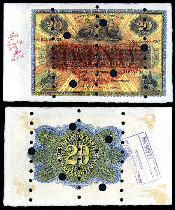Scotland, 1st September, 1947, 20 Pounds, P-S813, Unlisted Specimen, Face Blue with orange and red sunburst underprint, allegorical women flanking arms on top, Equestrian Statues on LL and LR, back blue, With archival notations including approval signatures and date, S/N B166/001, POC's, Choice XF to AU condition with mounting remnants on back. Rare note in any condition and very attractive. W&S.