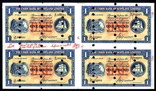 Uncut sheet of 4, Scotland, 1st March, 1949, 1 Pound, P-S816a, Unlisted Specimen, Printed signature of GENERAL MANAGER, Face Blue on red, orange and yellow underprint, Arms on left with sailboat on right, Face with archival notations and approval signatures, back blue and light yellow with industrial and shipping scene and bank handstamps, POC's, AU to Uncirculated condition with light mounting remnants on back corners. W&S.