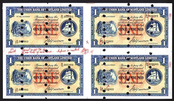 Uncut sheet of 4, Scotland, 1st March, 1949, 1 Pound, P-S816a, Unlisted Specimen, Printed signature of GENERAL MANAGER, Face Blue on red, orange and yellow underprint, Arms on left with sailboat on right, Face with archival notations and approval signatures, back blue and light yellow with industrial and shipping scene and bank hand stamps, POC's, AU to Uncirculated condition with light mounting remnants on back corners. W&S.