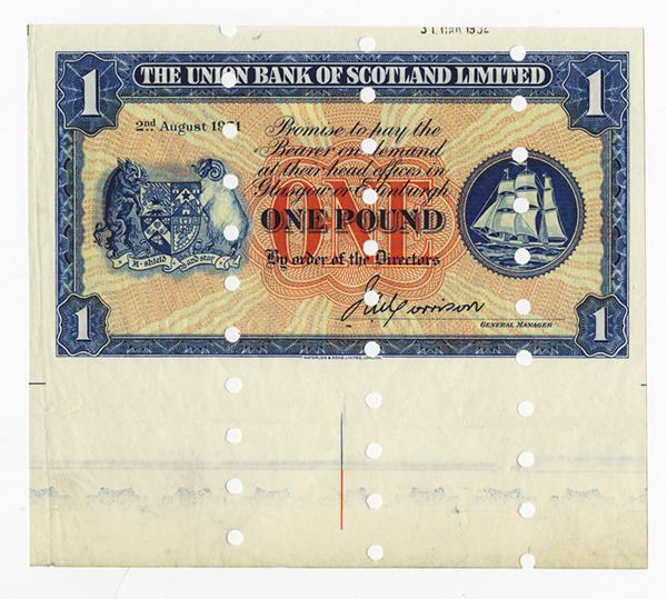 Edinburgh or Glasgow, Scotland. 1 Pound, P-S816a, unlisted as a specimen, Large excess margin on bottom, POC's, no serial numbers, AU condition. Rare as a specimen. W&S.