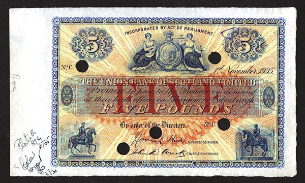 Scotland. Union Bank of Scotland, Ltd. 5 Pounds, 1.11.1935. P-S811cs. Unlisted in SCWPM Specialized. Printer's approval specimen with initials and dates in large left margin. Uniface.