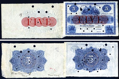 Lot of 2 pieces, Scotland, 6th October 1909, 5 Pounds, P-S806 Unlisted Specimen, No S/N's, with no signatures, Hand Stamped Cancelled and POC's, Also included is an undertint progress proof of the undertint FIVE. Both are in Fine to VF condition with light glue mounting remnant on back borders.