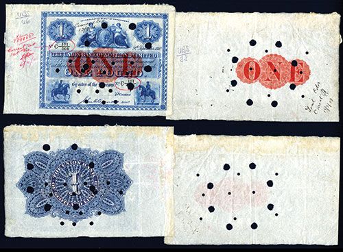 Lot of 2 pieces, Scotland, 9th September 1910, 1 Pound, P-S805 Unlisted Specimen, S/N C 101/001, with accountant signature, John Alexander, Hand written Cancelled and POC's, Also included is an undertint progress proof of the ONE. Both are in Fine to VF condition with light glue mounting remnant on back borders. W&S.