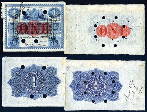Lot of 2 pieces, Scotland, 24th December 1914, 1 Pound, P-S805 Unlisted Specimen, face with archival notations, S/N D 7501/1000, with printed accountant signature, Hand Stamped Cancelled and POC's, Also included is an undertint progress proof of the ONE, Both are in Fine to VF condition with light glue mounting remnant on back borders.W&S.
