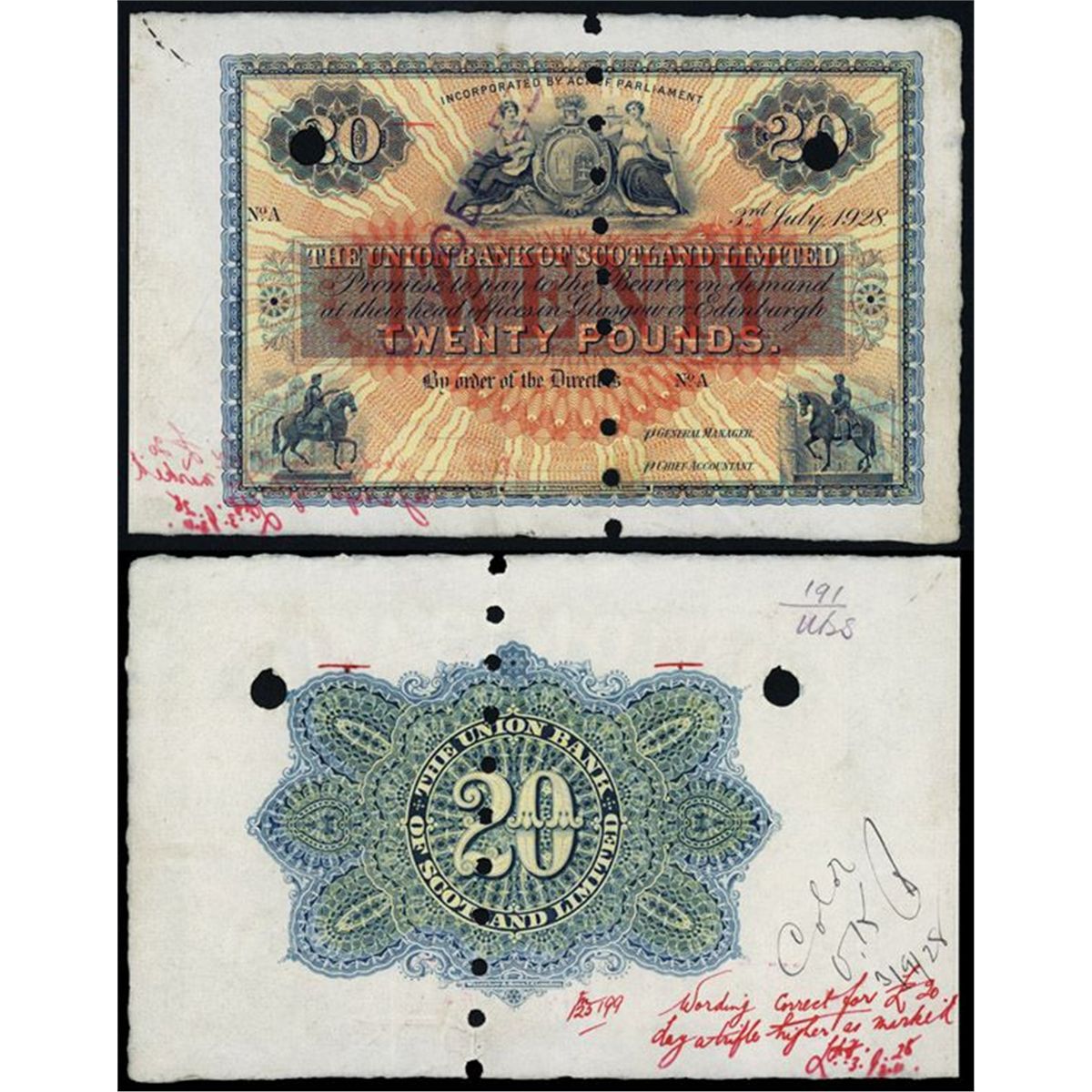 Scotland, 3rd July, 1928, 20 Pounds, P-S813a, Unlisted Specimen, Face Blue with orange and red sunburst underprint, allegorical women flanking arms on top, Equestrian Statues on LL and LR, back blue, back with archival notations including approval signatures and date, S/N A, POC's, Choice XF to AU condition. Rare note in any condition and very attractive. Catalogs $1575 in SCWPM as issued. W&S.
