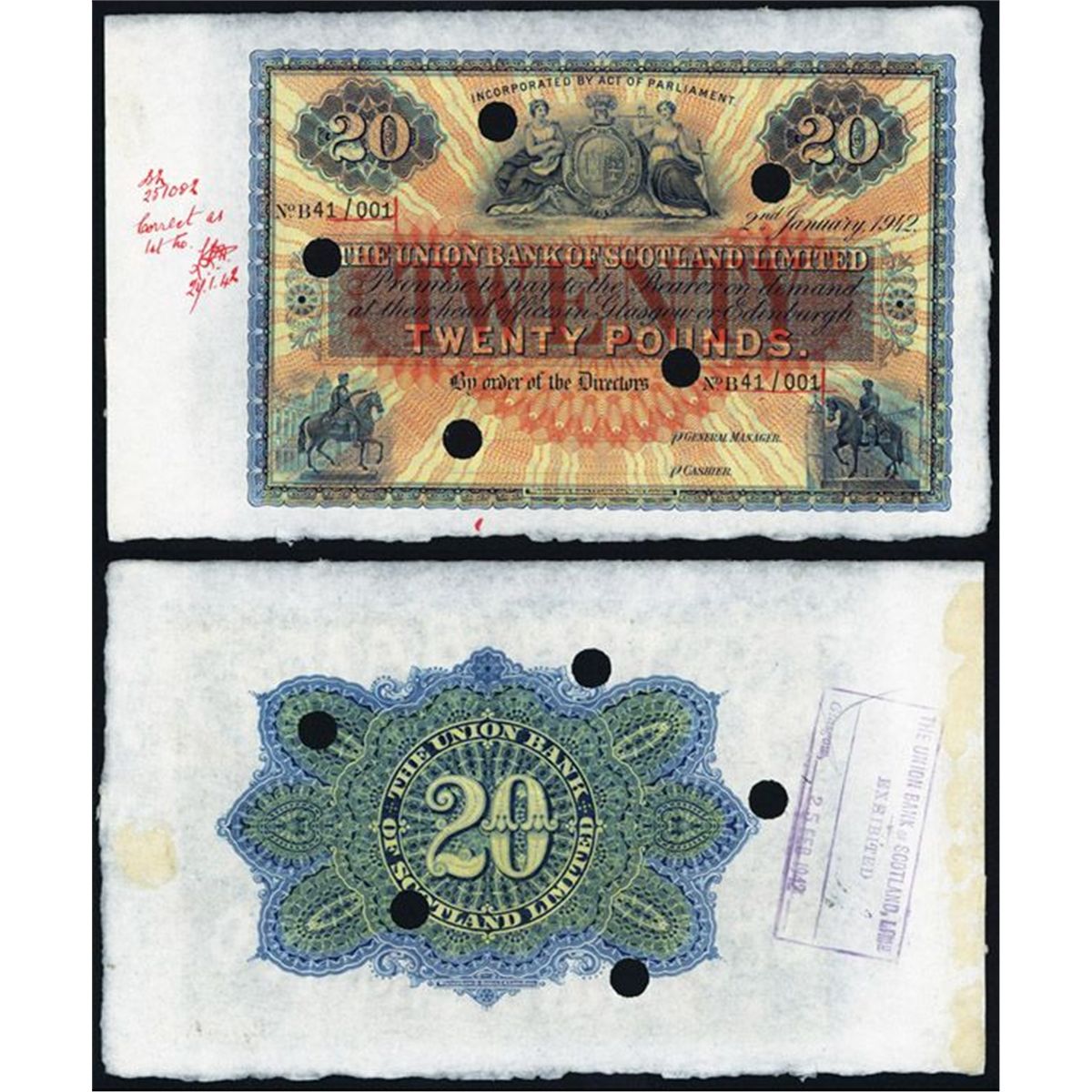 Scotland, 2nd January, 1942, 20 Pounds, P-S813c, Unlisted Specimen, Face Blue with orange and red sunburst underprint, allegorical women flanking arms on top, Equestrian Statues on LL and LR, back blue, Face with archival notations including approval signatures and date, S/N B 41/001, POC's, Choice AU to Uncirculated condition. W&S.