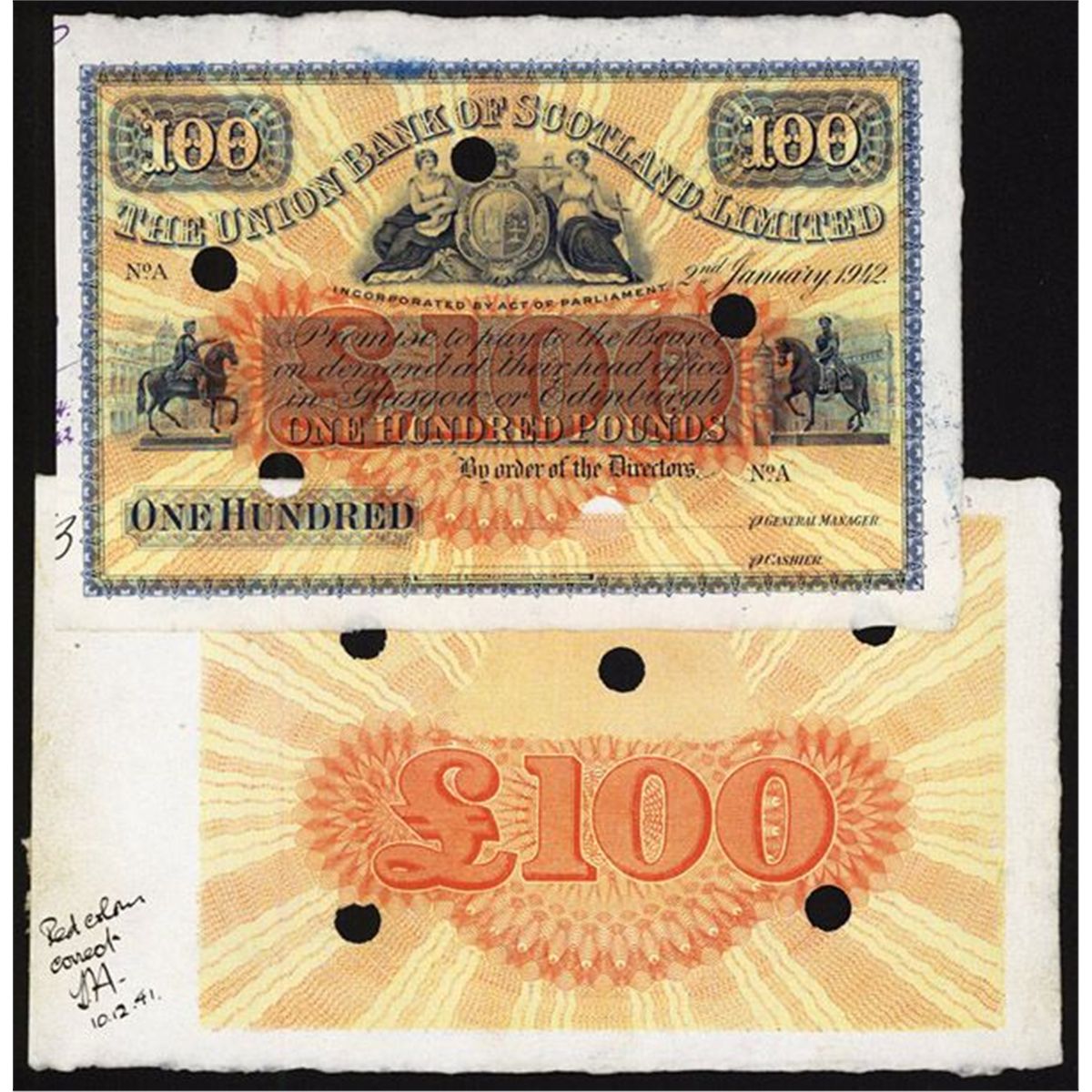 Lot of 2 pieces, Scotland, 2nd January, 1942, 100 Pounds, P-S814a, Unlisted Specimen, Face Blue with orange and red sunburst underprint, allegorical women flanking arms on top, Equestrian Statues on LL and LR, back blue, Face with archival notations on left margin “S/N A”, POC's, Choice AU to Uncirculated condition. Also includes underprint of face on separate sheet, Catalogs $5400 in Uncirculated as issued. W&S.