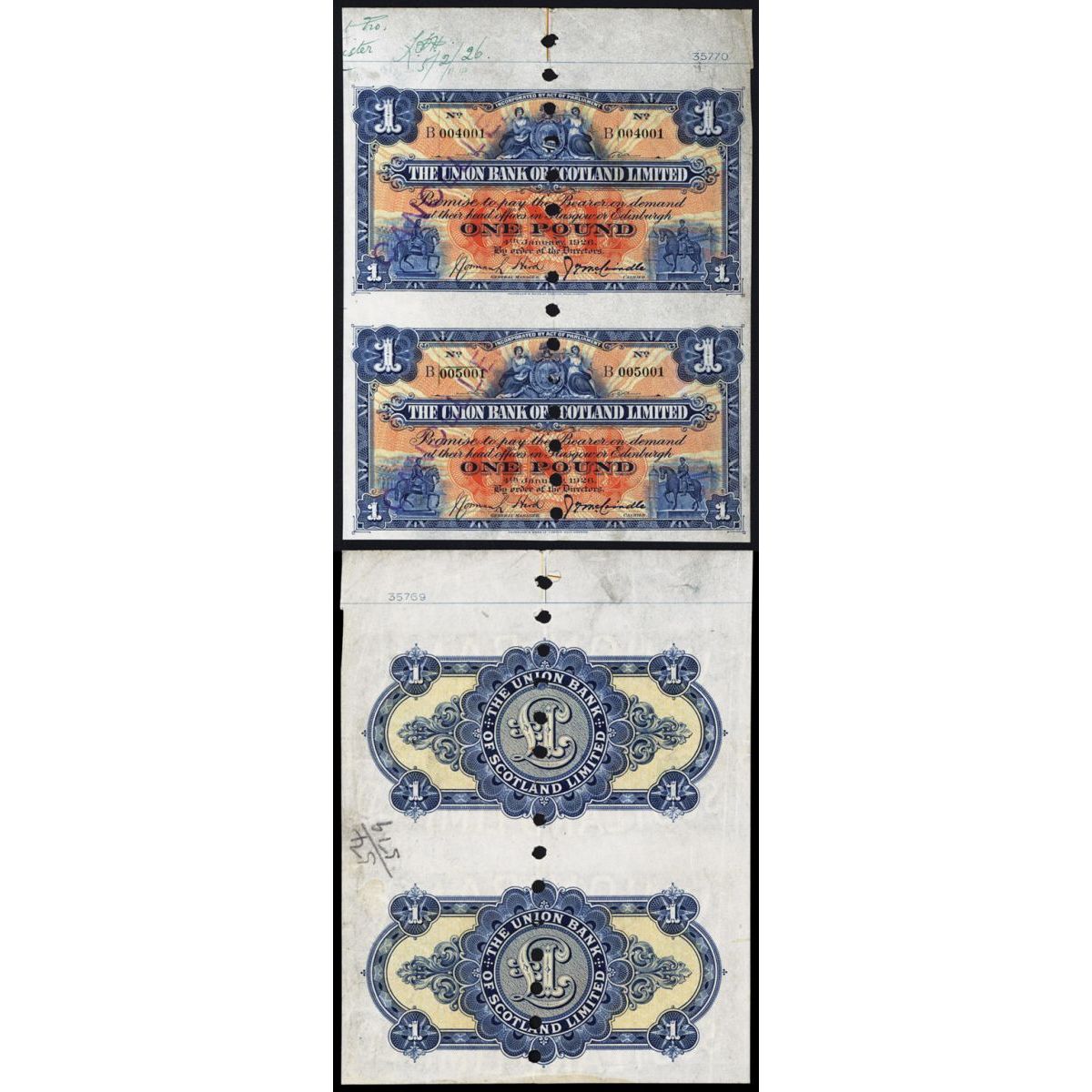 Uncut sheet of 2, Scotland, 4th January, 1926, 1 Pound, P-S815a, Unlisted Specimen pair, Printed signature of GENERAL MANAGER and CASHIER, Face Blue, red, orange and yellow, allegorical women flanking arms on top, Equestrian Statues on LL and LR, back blue and light yellow, Face with archival notations, S/N B004001-005001, POC's, Crisp Choice XF condition. W&S.