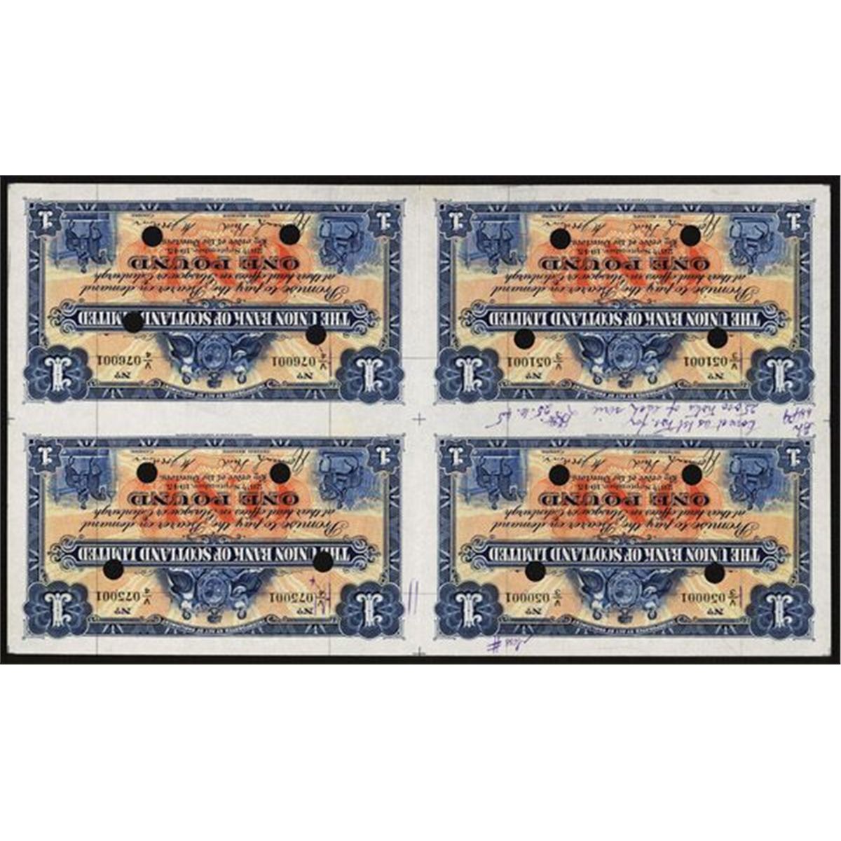 Uncut sheet of 4, Scotland, 28th September, 1945, 1 Pound, P-S815c, Unlisted Specimen, Printed signature of GENERAL MANAGER and CASHIER, Face Blue, red, orange and yellow, allegorical women flanking arms on top, Equestrian Statues on LL and LR, Face with archival notations and approval signatures, back blue and light yellow with purple bank handstamps, S/N V/3 050001-V/4 760001, POC's, Crisp Choice XF to AU condition with light mounting remnants on back. W&S.