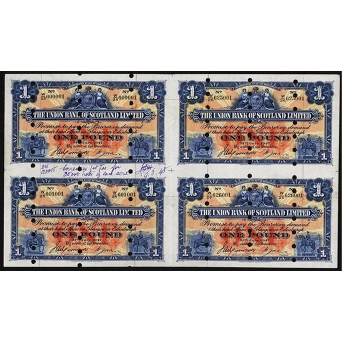 Uncut sheet of 4, Scotland, 31st, July 1947, 1 Pound, P-S815c, Unlisted Specimen, Printed signature of GENERAL MANAGER and CASHIER, Face Blue, red, orange and yellow, allegorical women flanking arms on top, Equestrian Statues on LL and LR, Face with archival notations and approval signatures, back blue and light yellow with purple bank handstamps, S/N W/25 600001-W/26 626001, POC's, Crisp Choice XF to AU condition with light mounting remnants on back. W&S.