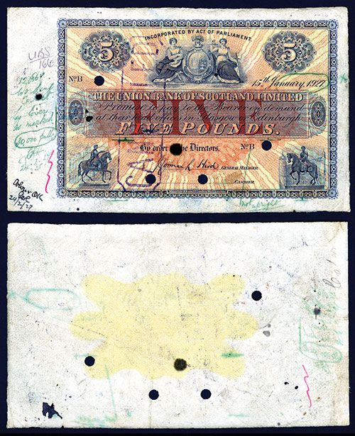 Scotland, 15th January 1927, 5 Pounds, P-S811b Unlisted Specimen, No S/N's, signature of Hird as General Mgr, Hand stamped Cancelled and POC's, Fine to VF condition with light glue mounting remnant on back borders. W&S.