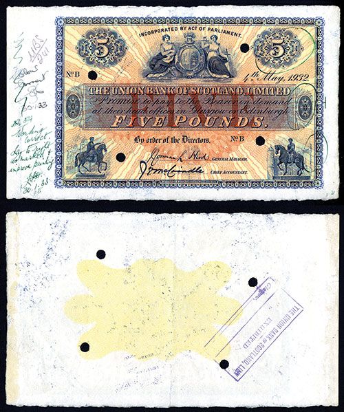 Scotland, 4th May, 1932, 5 Pounds, P-S811c, Unlisted Specimen, Face Blue with orange and red sunburst underprint, allegorical women flanking arms on top, Equestrian Statues on LL and LR, back with light yellow underprint only, No S/N, POC's, Choice XF to AU condition. W&S.