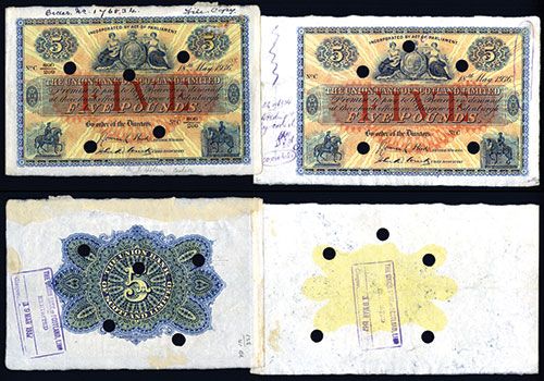 Lot of 2 notes, Scotland, 18th May 1928 and 5th March, 1936, 5 Pounds, P-S811c Unlisted Specimens, No S/N's on the partially printed note, the fully printed note has S/N C 800/200, signature of Hird as General Manager and Corick as Chief Accountant, POC's, VF to Choice VF condition with light glue mounting remnant on back borders. W&S.