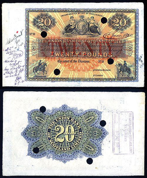 Scotland, 1st June 1940, 20 Pounds, P-S813b Unlisted Specimen, No S/N's, no printed signatures, POC's, Choice XF to AU condition. W&S.