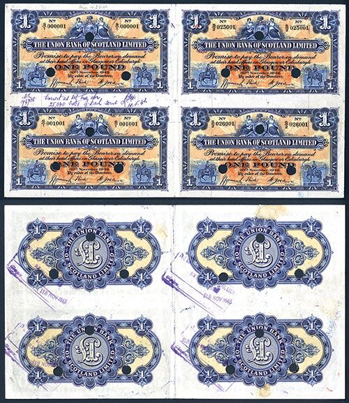 Uncut sheet of 4, Scotland, 30th November, 1942, 1 Pound, P-S815c, Unlisted Specimen, Printed signature of GENERAL MANAGER and CASHIER, approval signatures, back blue and light yellow with purple bank hand stamps, S/N S/1 000001 - S/2 025001, POC's, Crisp Choice VF to AU condition with light mounting remnants on back. W&S.