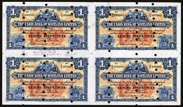 Edinburgh, Scotland. Uncut sheet of 4 banknotes, 1st, June 1948, 1 Pound, P-S815c, Unlisted as a Specimen, Printed signature of GENERAL MANAGER and CASHIER, Face Blue, red, orange and yellow, allegorical women flanking arms on top, Equestrian Statues on LL and LR, Face with archival notations and approval signatures, back blue and light yellow with purple bank handstamps, S/N X/3 050001-X/4 076001, POC's, If cut up, the notes would grade choice AU to CU condition, 2 of the notes have light evidence of previous mounting. W&S.