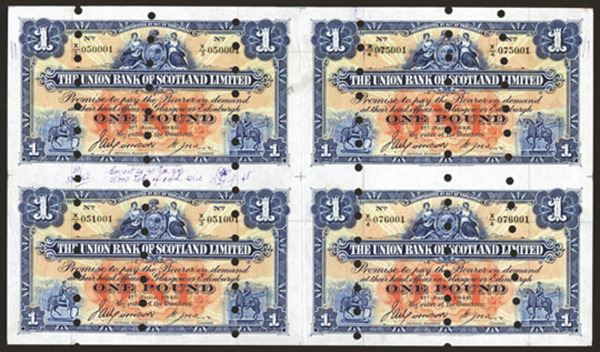 Edinburgh, Scotland. Uncut sheet of 4 banknotes, 1st, June 1948, 1 Pound, P-S815c, Unlisted as a Specimen, Printed signature of GENERAL MANAGER and CASHIER, Face Blue, red, orange and yellow, allegorical women flanking arms on top, Equestrian Statues on LL and LR, Face with archival notations and approval signatures, back blue and light yellow with purple bank handstamps, S/N X/3 050001-X/4 076001, POC's, Crisp Choice XF to AU condition with light mounting remnants on back. W&S.