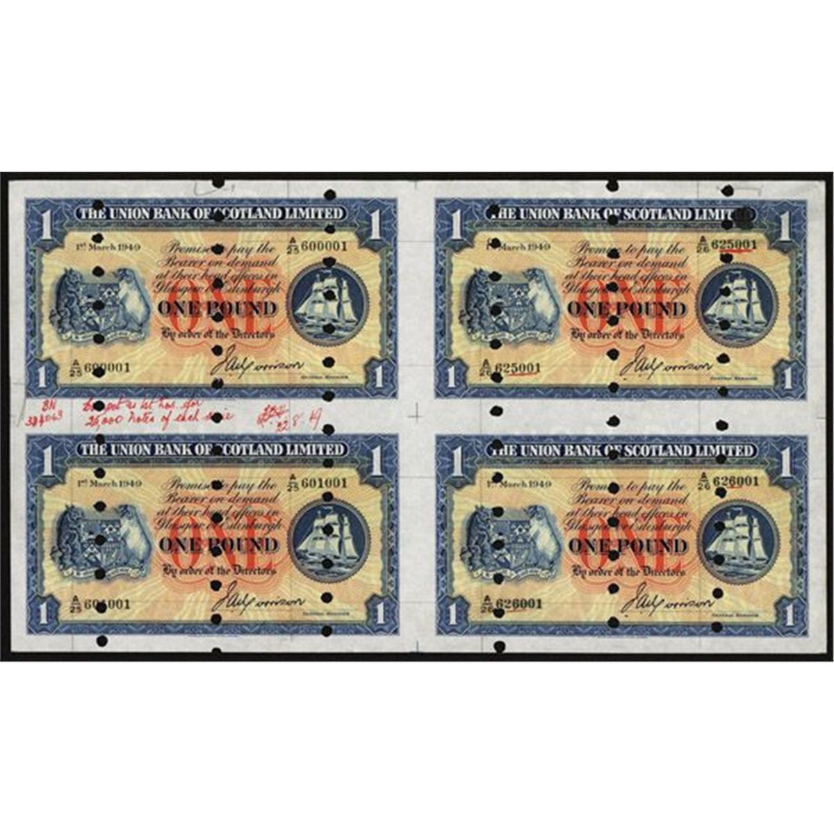 Uncut sheet of 4, Scotland, 1st March, 1949, 1 Pound, P-S816a, Unlisted Specimen, Printed signature of GENERAL MANAGER, Face Blue on red, orange and yellow underprint, Arms on left with sailboat on right, Face with archival notations and approval signatures, back blue and light yellow with industrial and shipping scene and bank handstamps, S/N A/25 600001-A/26 626001, POC's, Uncirculated condition with light mounting remnants on back corners. W&S.