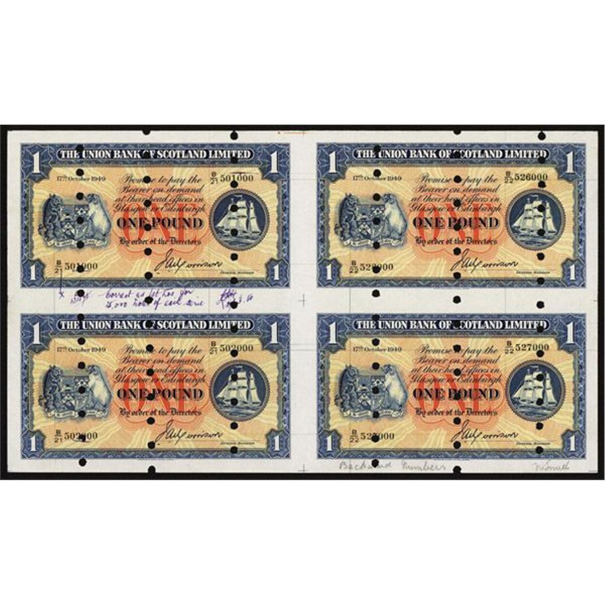 Uncut sheet of 4, Scotland, 17th October, 1949, 1 Pound, P-S816a, Unlisted Specimen, Printed signature of GENERAL MANAGER, Face Blue on red, orange and yellow underprint, Arms on left with sailboat on right, Face with archival notations and approval signatures, back blue and light yellow with industrial and shipping scene, purple bank handstamps, S/N B/21 501000-B/22 527000, POC's, Uncirculated condition with light mounting remnants on back right pair of notes. W&S.