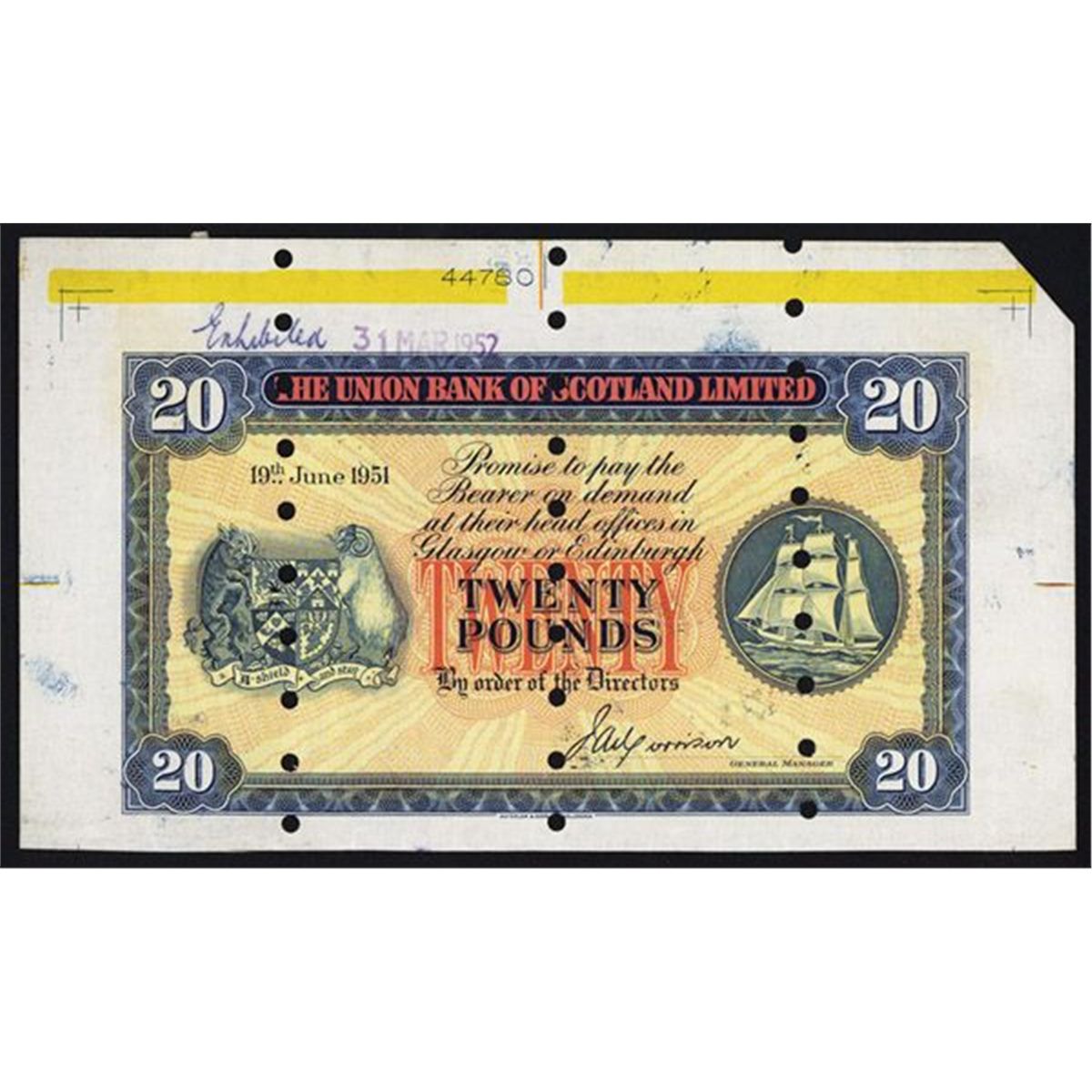 Scotland, 19th June, 1951, 20 Pounds, P-S818, Unlisted Specimen, Morrison signature, Face Blue with red, orange and yellow sunburst underprint, Arms at left, sailboat at right, back only with light yellow underprint, Archival notations on face, No S/N's, POC's, Choice AU to Uncirculated condition with light glue stains on the back top corners. W&S.