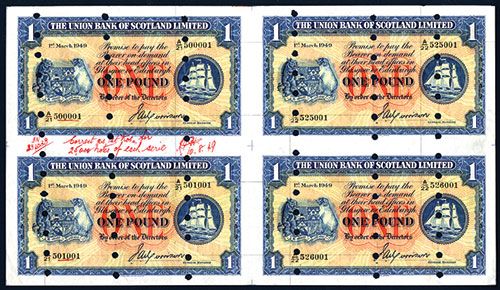 Uncut sheet of 4, Scotland, 1st, March 1949, 1 Pound, P-S816a, Unlisted Specimen, Printed signature of GENERAL MANAGER, S/N A/19 450001 to A/20 476001, POC's, Crisp Choice XF to AU condition with light mounting remnants on back. W&S.