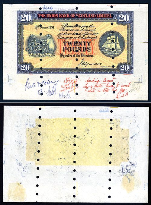 Scotland, 19th June, 1951, 20 Pounds, P-S818, Unlisted Specimen, Morrison signature, Archival notations on face, No S/N's, POC's, Choice XF to AU condition with light glue stains on the back top corners. W&S.