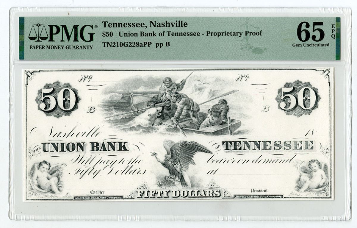 Nashville, Tennessee, ND (1860s). $50, TN210G228aPP, Proprietary Proof Note, Black print with whalers attacked by polar bear at top and Bald Eagle at bottom, S/N None pp B, PMG graded Gem Uncirculated 65 EPQ, ABNC.
