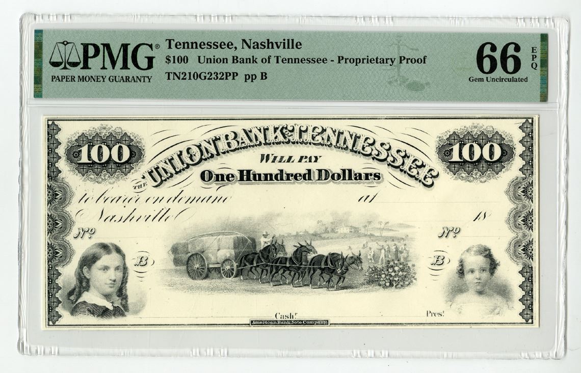 Nashville, Tennessee, ND (1860s - reprinted 1950-60s). $100, TN210G232PP, Proprietary Proof Note, Uniface note with black print, Horse drawn cart at center with young girls at each bottom corner, PMG graded Gem Uncirculated 66 EPQ, ABNC.