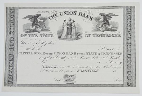 Tennessee. Odd Shares Capital Stock Certificate Proof, Black print on white india paper mounted on thin card, Arms of Tennessee below title flanked by Patriotic Bald Eagles, VF-XF condition, Cha.Toppan & Co.
