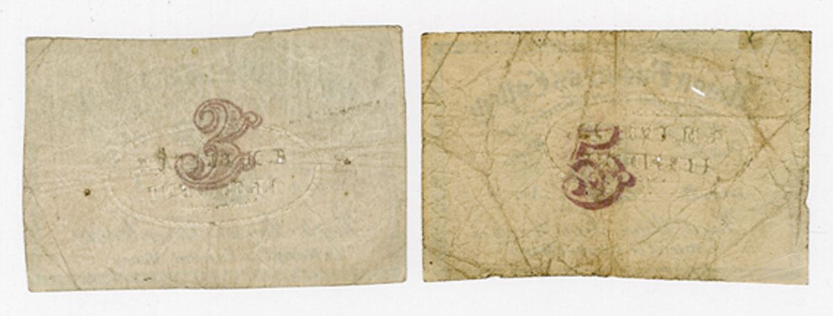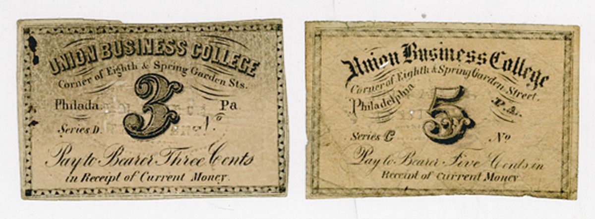 Philadelphia, Pennsylvania. Lot of 2 notes, (ca,1860-70s), Lot of 2 notes, includes 3cent, and 5cent examples, black on pink underprint, numerals on back, Fine to Choice Fine with pin holes, Scarce College Currency notes.
