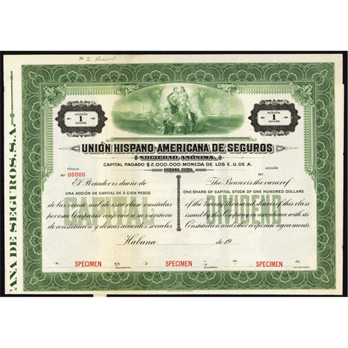 Cuba, 19xx (ca.1920-300), 1 preferred share, Capital Pagado $2000000 Moneda De Los E. U. De A., Specimen, Black on green border and underprint, Two standing allegorical woman on top center flanked by industry on the left with mother sitting and shipping on the right with elderly man sitting, Dividend Coupons attached, VF-XF condition, American BNC.
