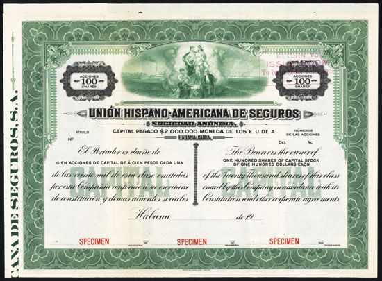 Cuba, 19xx (ca.1900-20), 100 Shares dividend coupons attached, Black on green border and underprint, Allegorical women at top standing over old man and woman with baby with ships and factories in the back ground. Specimen, POC's, ABNC