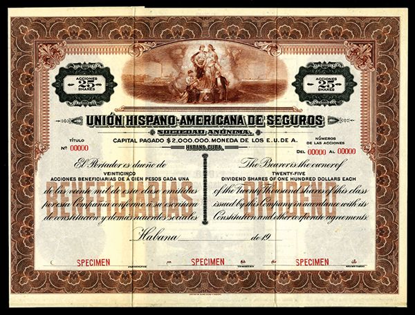 Union Hispano-Americana De Seguros Specimen Bond. Habana, Cuba, 19xx (ca.1900-20), 25 Shares, dividend coupons attached, Black on brown border and underprint. Specimen, POC's, ABNC, VF.