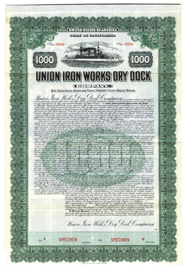 California. $1000 Specimen 6% Sinking Fund Gold Coupon Bond, Black print on green border and under tint, Large battleship at sea at top, Specimen overprints and POC's, VF-XF condition, FL-ABNC. Union Iron Works, located in San Francisco, California, on the southeast waterfront, was a central business within the large industrial zone of Potrero Point, for four decades at the end of the nineteenth and beginning of the twentieth centuries. In 1885, the Union Iron Works launched the first steel-hulled ship on the west coast, Arago, built with steel from the Pacific Rolling Mills. In 1886, UIW was awarded a $1,000,000 contract to build the cruiser USS Charleston for the United States Navy, which they completed in eighteen months. From the completion of Arago in 1884 to 1902, UIW built seventy-five marine vessels, including two of the most famous vessels of the SpanishÐAmerican War, USS Olympia and USS Oregon. Rare bond.