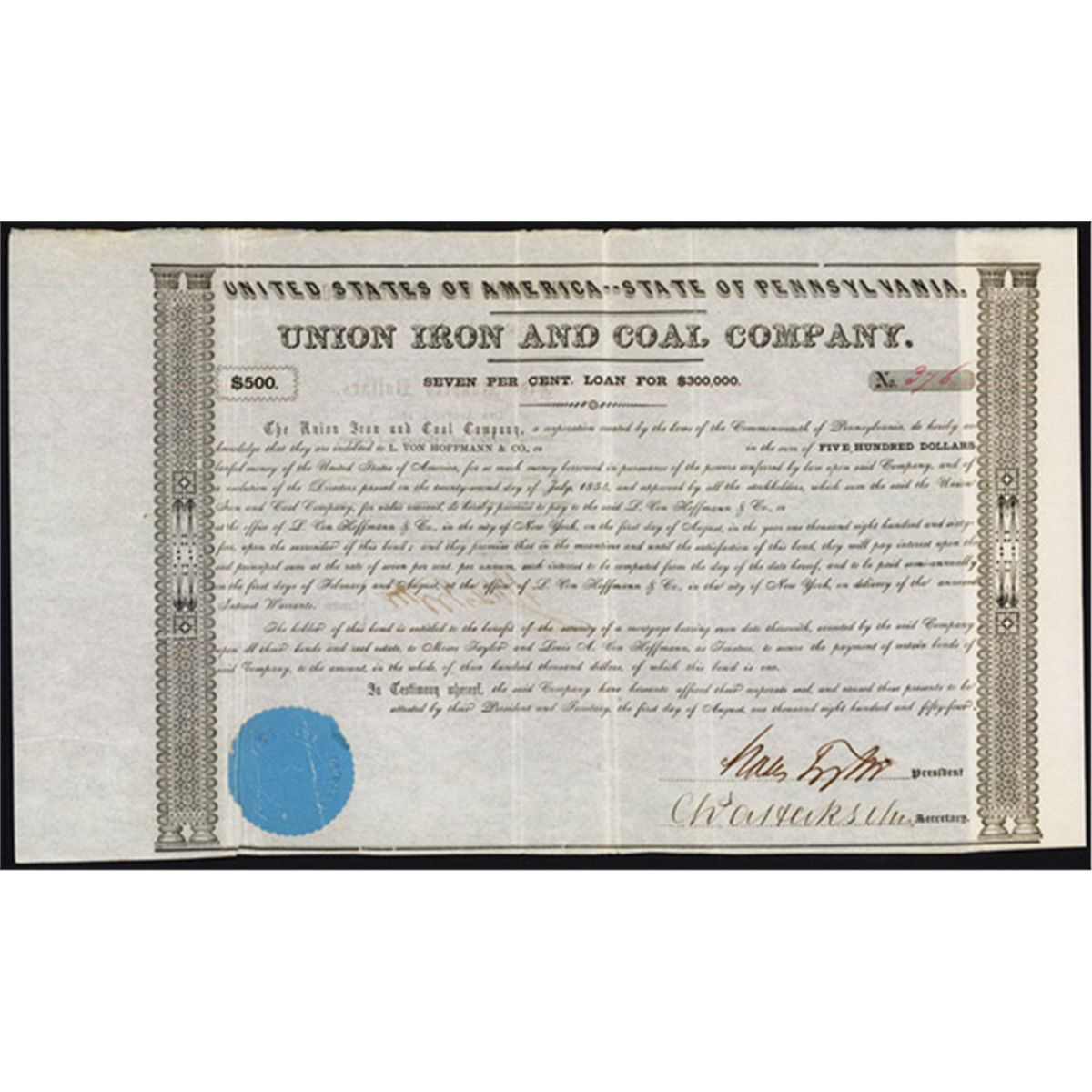 Pennsylvania, 1854, $500, 7% Loan, Issued and uncancelled, Black with blue seal, ornate end panels, no vignette, Cert.# 376, Signed by Moses Taylor as president. Taylor was an important financer and banker from early Wall Street History. He was treasurer of Cyrus W. Field's Atlantic Cable attempt and also helped float the large bond issues financing the Civil War. He was also a president of National City Bank (today's Citi-Bank).