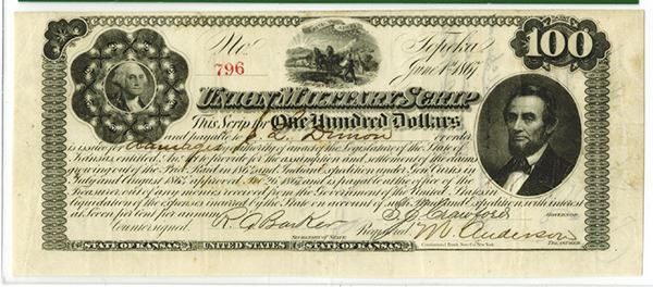Topeka, Kansas. June 1st, 1867, $100, Whitfield 426, issued obsolete banknote, Black printing with red serial numbers, Lincoln at right, Kansas seal in middle top, Washington in medallion at top left, S/N 796, PCGS graded Very Fine 30. (Ex-Eric P. Newman Collection).
