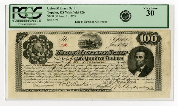 Topeka, Kansas. June 1st, 1867, $100, Whitfield 426, issued obsolete banknote, Black printing with red serial numbers, Lincoln at right, Kansas seal in middle top, Washington in medallion at top left, S/N 796, PCGS graded Very Fine 30. (Ex-Eric P. Newman Collection).