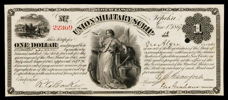 Union Military Scrip Obsolete Banknote.Topeka, KS, 1867, $1, Series A, Whitfield 421, R4, Issued with endorsements on back, Black without underprint, Arms of Kansas on the upper left, Allegorical topless woman with doves and cannon in middle, POC's, Uncirculated to CU condition. Continental BNC. (Round Mountain Collection, Part 1).