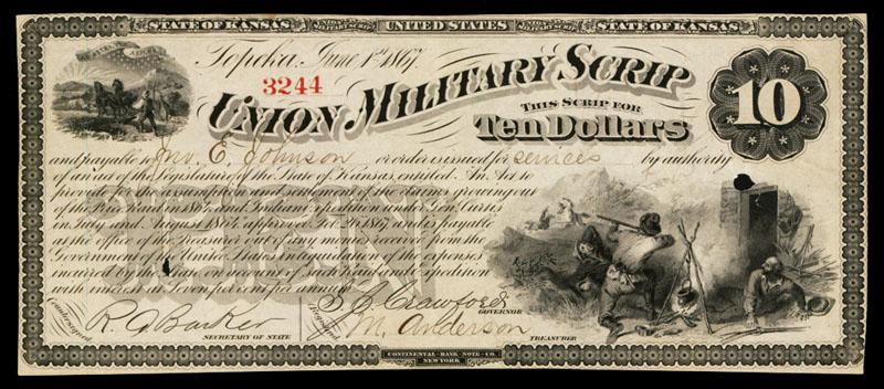 Union Military Scrip Obsolete Banknote.Topeka, KS, 1867, $10, Whitfield 423, R4, Issued with endorsements on back, Black without underprint, Arms of Kansas on the upper left, pioneers in indian fight on lower right, POC's, Uncirculated condition with POC and spindle holes. Continental BNC. (Round Mountain Collection, Part 1).