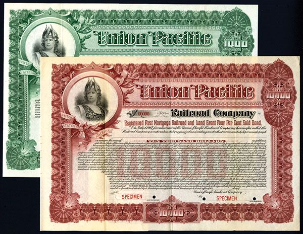 Lot of 2 Union Pacific Specimen Bonds, 1897; 1)$1000 Registered 1st Mortgage 4% Specimen Bond. Black print with green border and underprint. Allegorical women with helmet top left corner. POC's and red SPECIMEN overprints. VF condition. ABNC. Listed railroad and bond in Cox. 2)$10000 Registered 1st Mortgage 4% Specimen Bond. Black print with red border and underprint. Allegorical women with helmet top left corner. POC's and red SPECIMEN overprints. VF condition. IBNC. Listed railroad but unlisted bond in Cox.