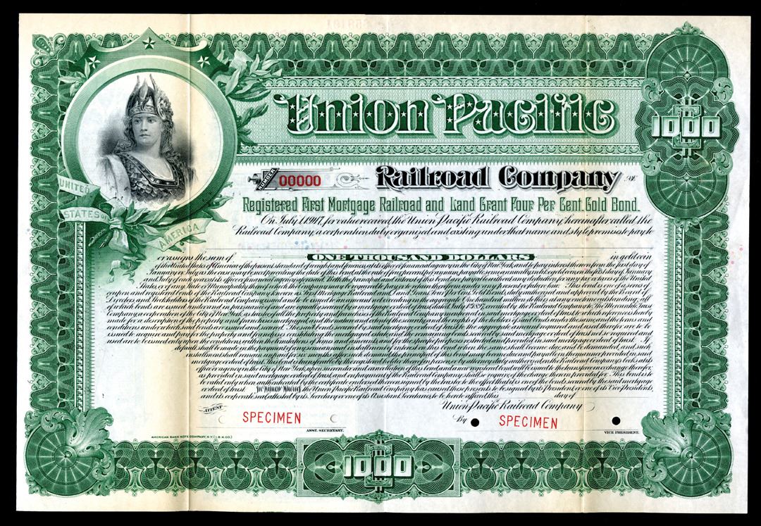 Utah. 1897, 4% Registered 1st Mortgage and Land Grant Gold Specimen Bond, Horizontal format, Black on green border and underprint, Allegorical woman top left corner, POC's, VF condition, IBNC.